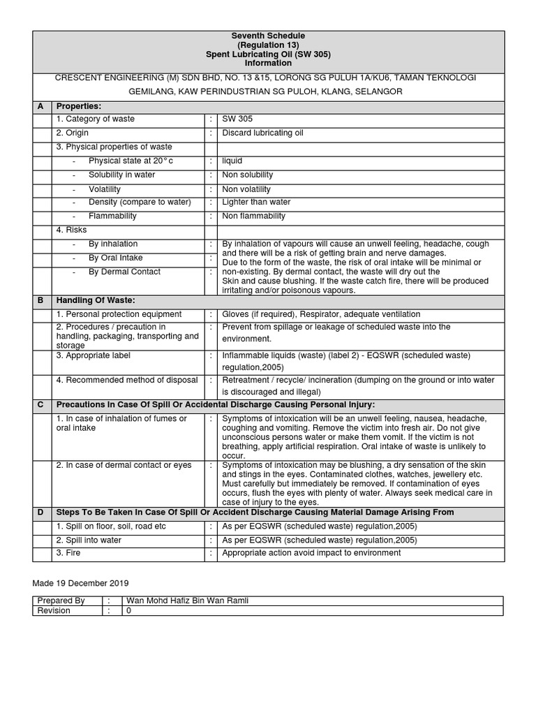 CRESCENT ENGINEERING M SDN BHD NO. SEVENTH SCHEDULED Regulation 13 INFORMATION SW322 WASTE OF NON-HALOGENATED ORGANIC SOLVENTS pg. Please remember that City.